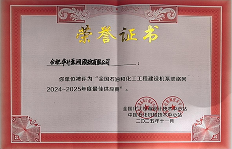 شركة هيفي هواشنغ للمضخات والصمامات المحدودةوقد مُنحت مؤخراً "أفضل مورد"تكريم من قبل الشبكة الوطنية لمضخات هندسة البترول والكيمياء للفترة 2024-2025. ويعكس هذا التقدير الخبرة الفنية القوية للشركة، وجودة منتجاتها الموثوقة، وخدماتها المتميزة في مجال معدات السوائل لصناعة البترول والكيماويات.